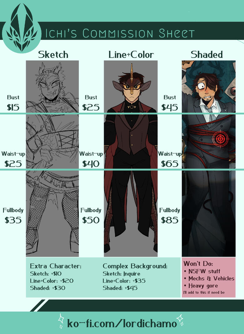 Pricing works as shown above- there are 3 separate levels of polish: Sketch, Line+Color, and Shaded. These are available in 3 different sizes: Bust, Waist-up, and FullbodyAdditionally, I also offer Emojis for Discord and other such sites- $25 for one, $75 for a pack of five.