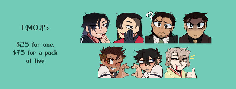 Pricing works as shown above- there are 3 separate levels of polish: Sketch, Line+Color, and Shaded. These are available in 3 different sizes: Bust, Waist-up, and FullbodyAdditionally, I also offer Emojis for Discord and other such sites- $25 for one, $75 for a pack of five.